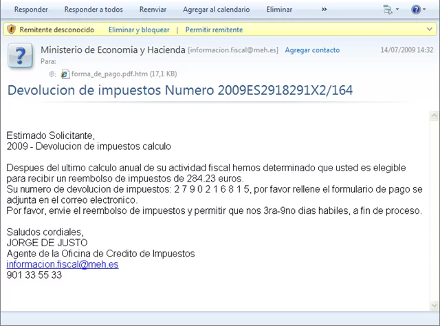 Es increí­ble como intentar engañarnos con burdos mensaje, mal escritos, con infinidad de faltas ortográficas y unas cuantas faltas gramaticales. Y aún así­ seguro que hay gente que pica y les da los datos que le piden tranquilamente. El mensaje trae adjunto un fichero que simula ser un .pdf, pero que en realidad es un .htm como podéis ver en la imagen de más abajo.