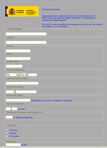 Al abrir el fichero adjunto aparece una pagina web que nos solicita una serie de datos personales como nombre, apellidos, dirección, teléfonos y, lo más importante. Nº de tarjeta de crédito, fecha de expiración de la misma e incluso el código de verificación (3 cifras que van el la banda de la firma en la parte trasera de la tarjeta). Abajo tenéis el formulario: